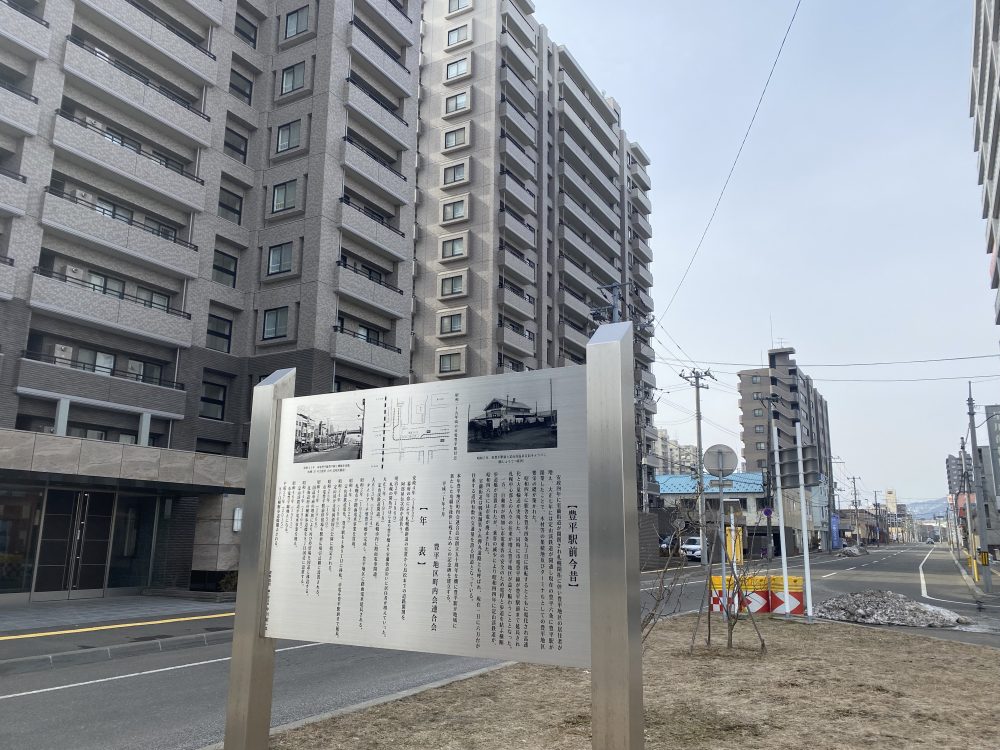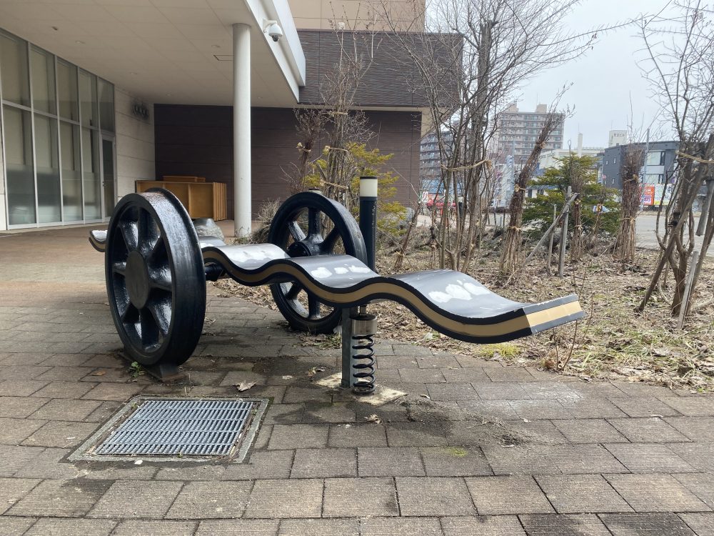 旧線の廃線跡は途中で進行方向を変え、東札幌方面へと向かっていました。このルートは1941年(昭和16年)に白石駅での旅客営業が廃止され、後に苗穂ルートが整備されたことで、東札幌駅が新たに開業。ここで、北海道鉄道(旧・千歳線)と接続されることになります。現在のラソラ札幌付近になります。往時を偲ぶ車輪のモニュメントが設置されていました。