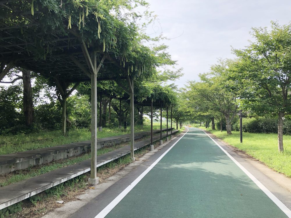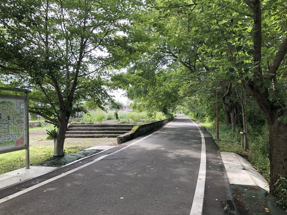 このサイクリングロードはさらに先までずっと続いており、道のりは長くなりますが、木々の間から差し込む木漏れ日が心地よく、快適に走ることができます。
