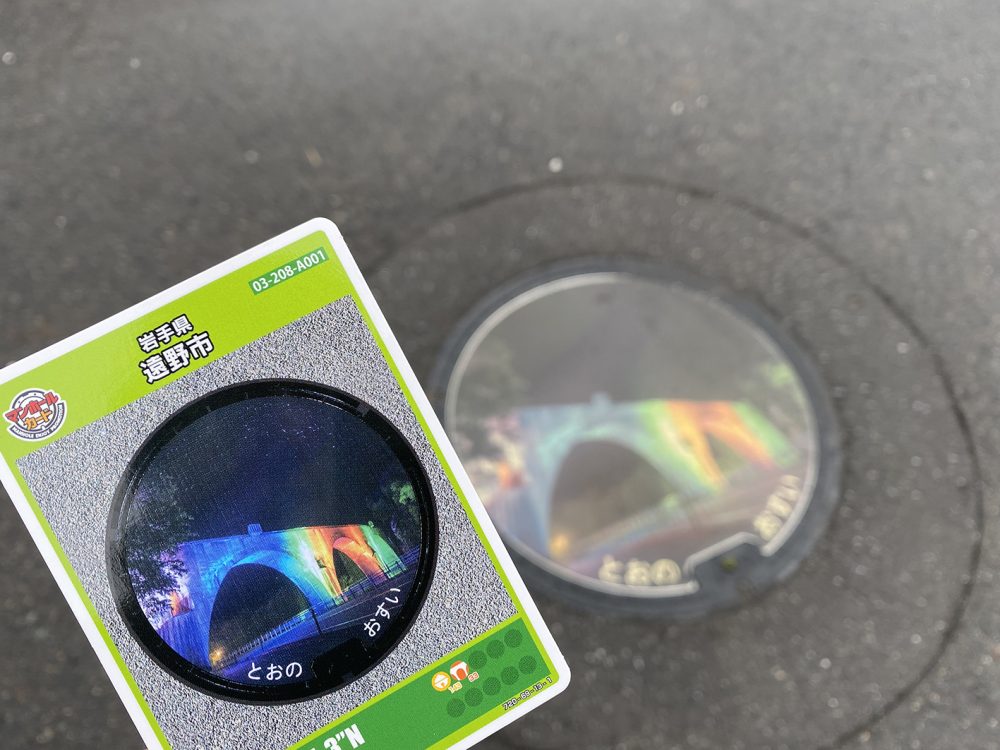 釜石線の「宮守川橋梁」に視線が奪われがちですが、その手前にある橋脚が岩手軽便鉄道のものです。しかし、現在の「宮守川橋梁」も美しいフォルムをしています。夜にはライトアップされ、その光景はまさに銀河鉄道です。近くの道の駅 みやもり「清流とわさびの里」でマンホールカードをいただきました。そして、そのマンホールは向かいのコンビニのそばにありました。美しいですね!