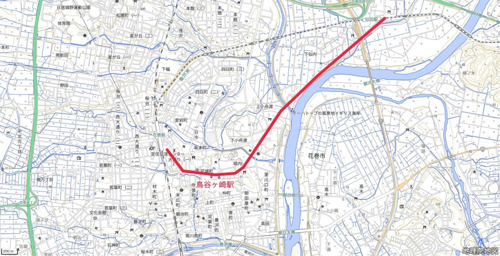 釜石線は岩手軽便鉄道廃線跡をなぞっていますが、花巻駅-似内駅間は下記のようなルートを通っていました。岩手軽便鉄道の花巻駅は現在の花巻駅のやや南側にありました。そして、花巻駅-似内駅間には鳥谷ヶ崎駅という駅がありました。これは宮沢賢治の『猫の事務所』に登場する「軽便鉄道の駅」のモデルとなった駅です。またこの区間の廃線跡沿いには「イギリス海岸」があります。その姿がドーバー海峡の白亜の海岸に似ていたことから、賢治は憧れを込めて名付けた場所です。作品、「イギリス海岸」の中で「イギリスあたりを歩いている気がする」と記しました。