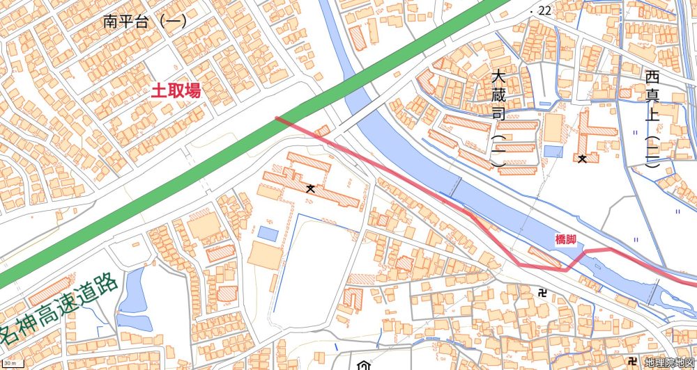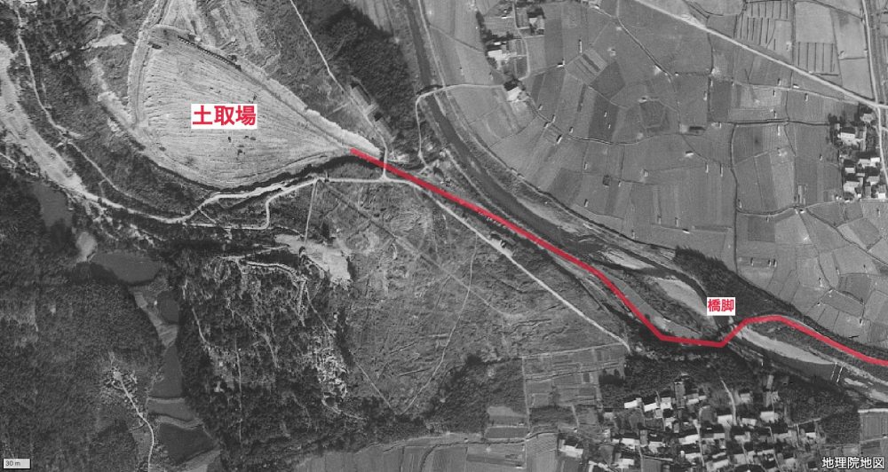芥川右岸の土取場を出発したトロッコ列車は堤防上を進み、郡家本町にあった橋を渡って左岸に出て、芥川の堤防上を南下します。芥川大橋を過ぎてから再び川を渡って右岸に出て、淀川堤防へと向かいました。土木工事現場に到着すると、トロッコを傾けて土を降ろしました。レールは柱本四丁目辺りまであったようです。